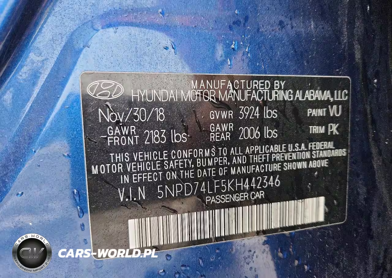 Copart Nr: C-41726386 VIN: 5NPD74LF5KH442346 Port: Elizabeth, NJ