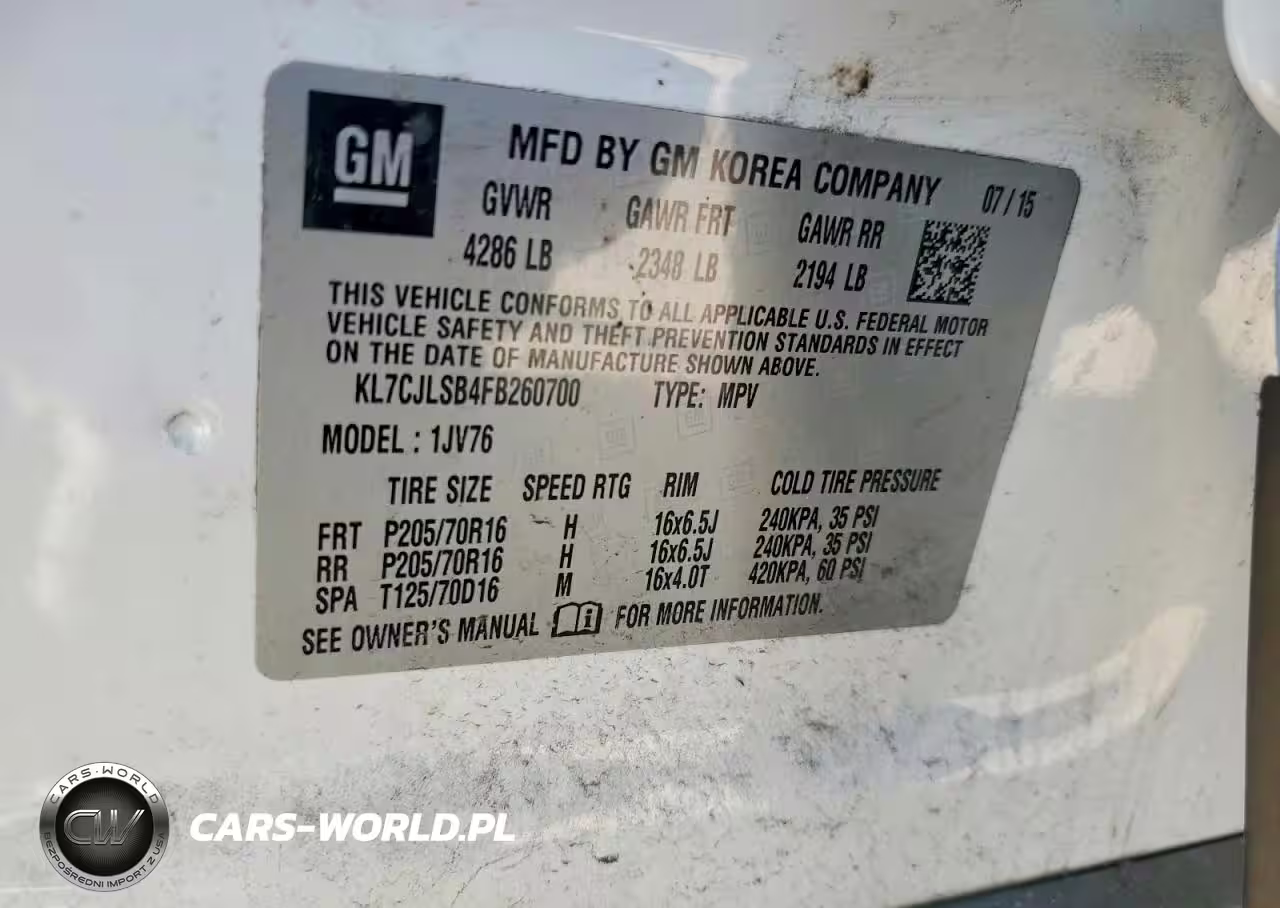 Copart Nr: C-41933266 VIN: KL7CJLSB4FB260700 Port: Los Angeles, CA