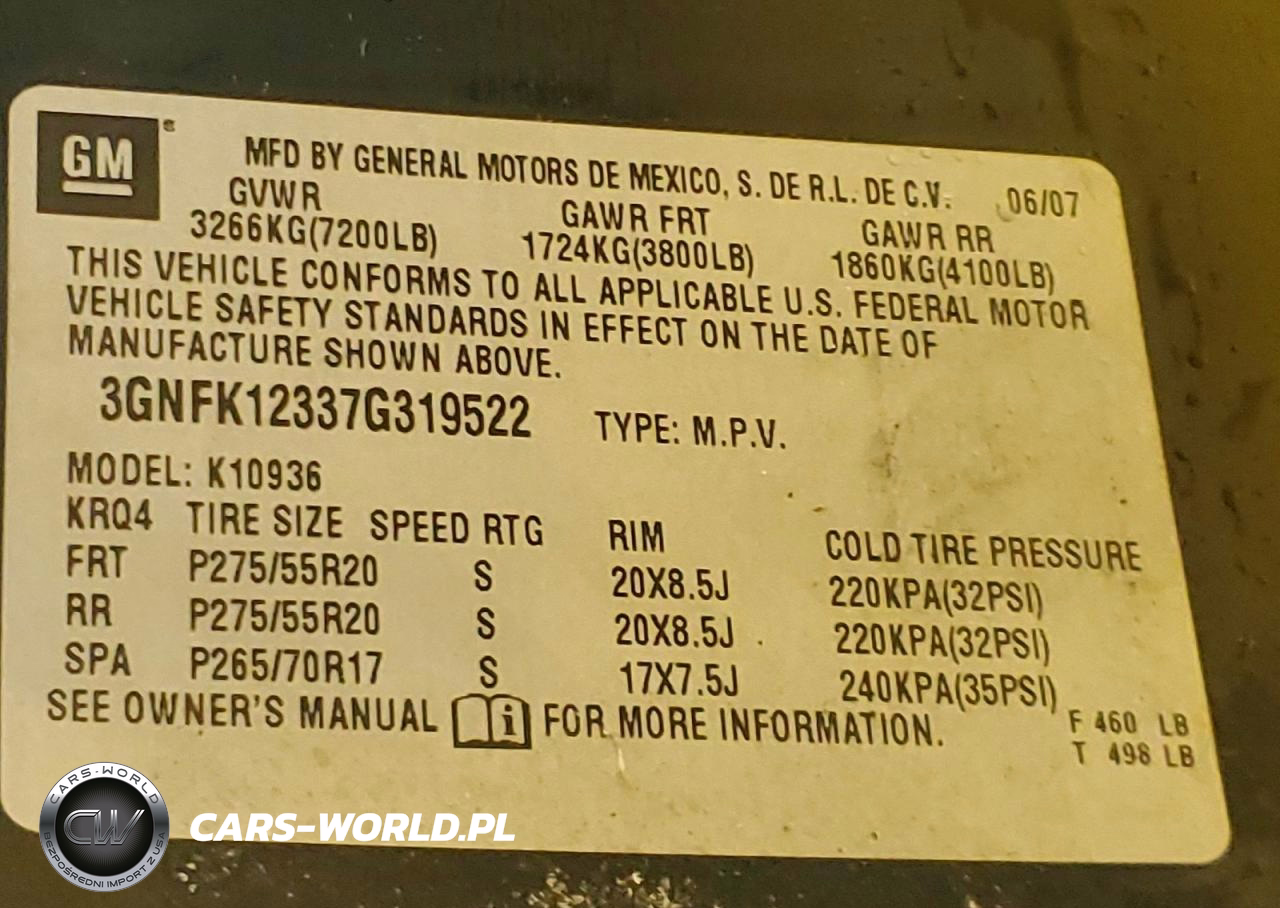 Copart Nr: C-45791076 VIN: 3GNFK12337G319522 Port: Indianapolis, IN