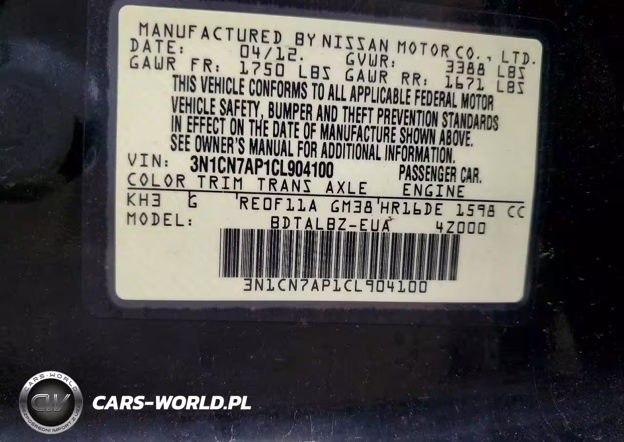Copart Nr: C-45953846 VIN: 3N1CN7AP1CL904100 Port: Indianapolis, IN