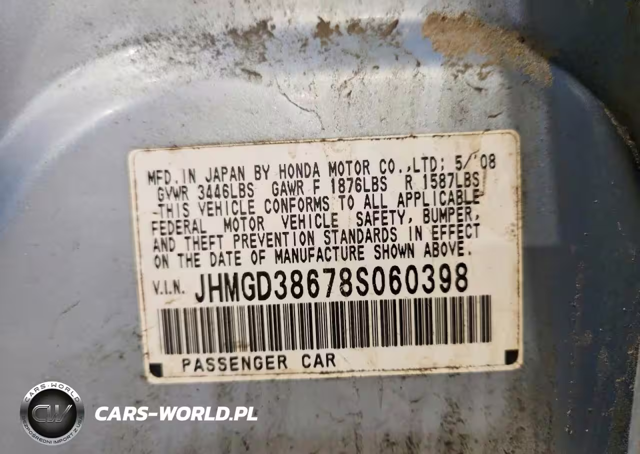 Copart Nr: C-46083436 VIN: JHMGD38678S060398 Port: Elizabeth, NJ