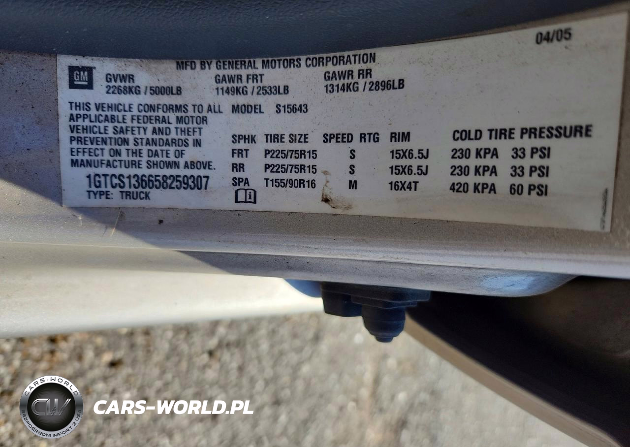 Copart Nr: C-46143066 VIN: 1GTCS136658259307 Port: Savannah, GA