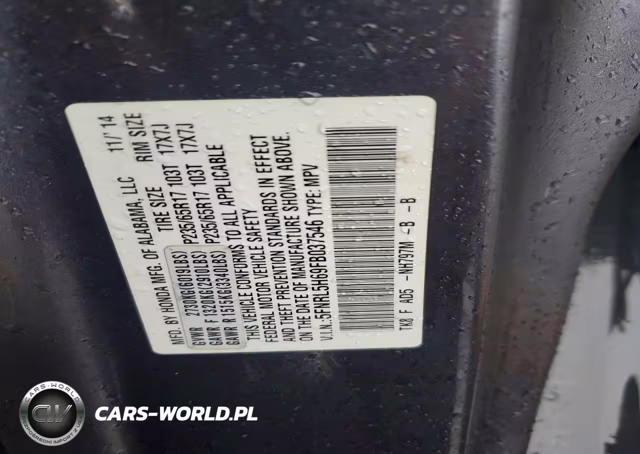 Copart Nr: C-46152576 VIN: 5FNRL5H69FB037546 Port: Elizabeth, NJ