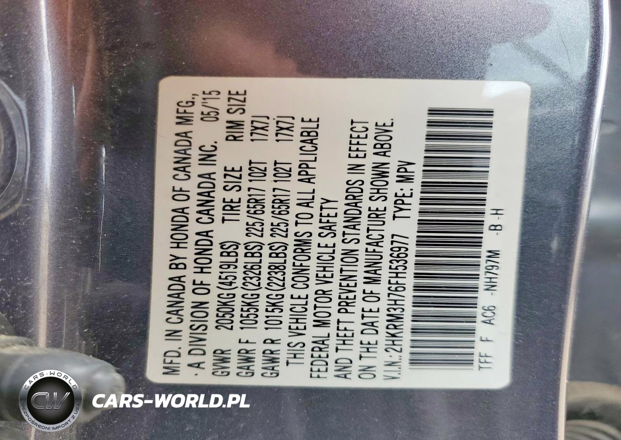 Copart Nr: C-46278616 VIN: 2HKRM3H76FH536977 Port: Indianapolis, IN