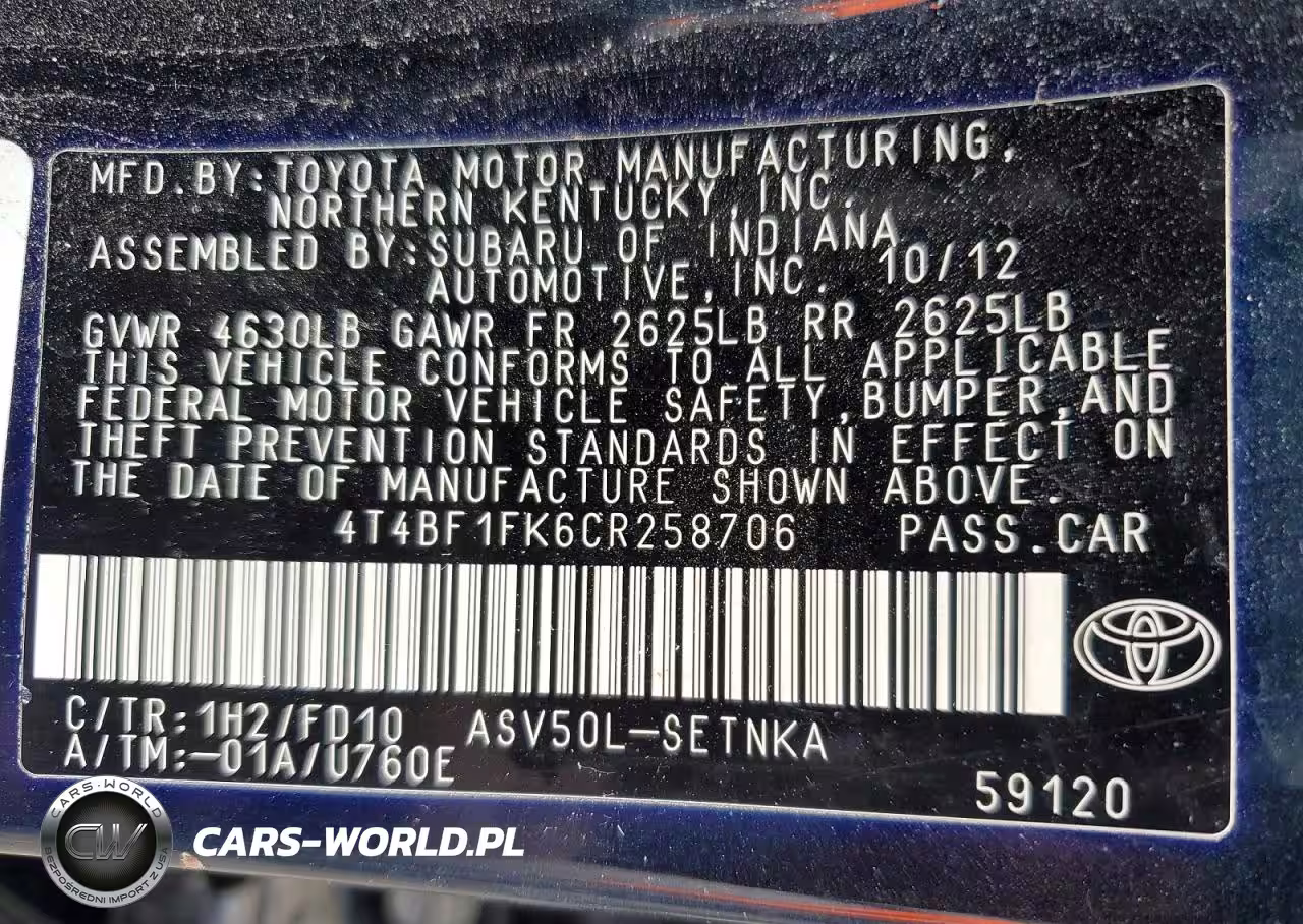 Copart Nr: C-46324756 VIN: 4T4BF1FK6CR258706 Port: Elizabeth, NJ