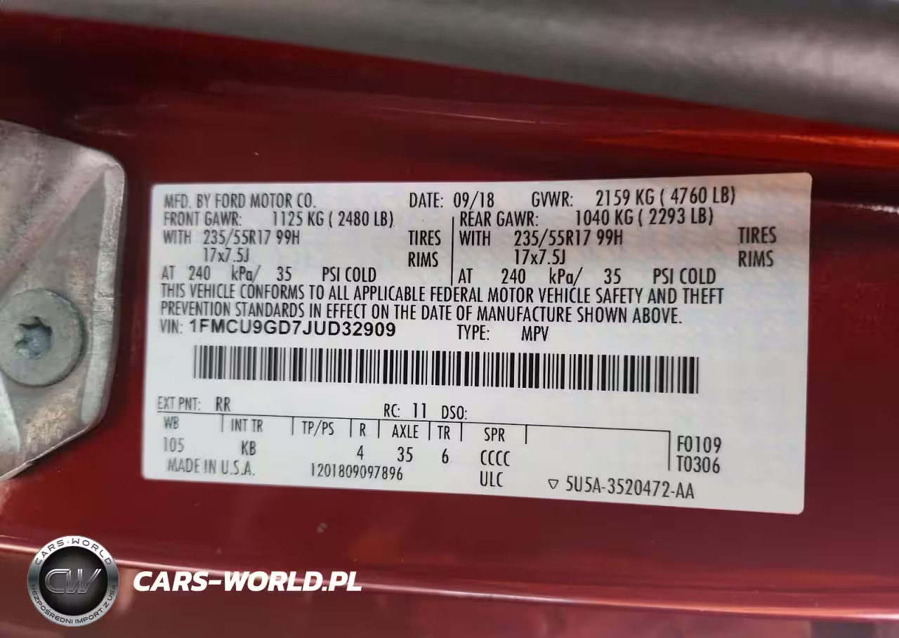 Copart Nr: C-46492546 VIN: 1FMCU9GD7JUD32909 Port: Elizabeth, NJ