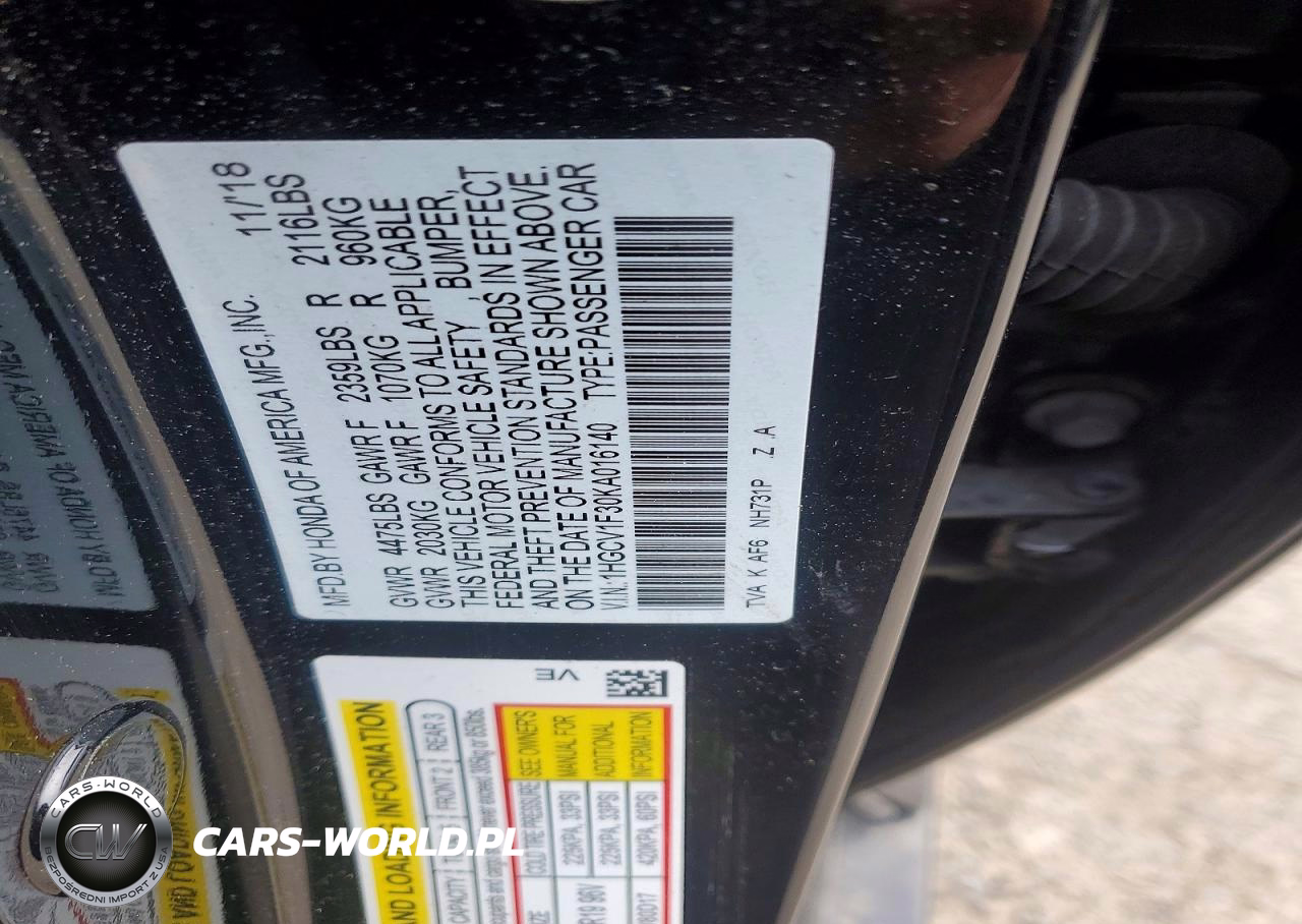 Copart Nr: C-46591016 VIN: 1HGCV1F30KA016140 Port: Elizabeth, NJ
