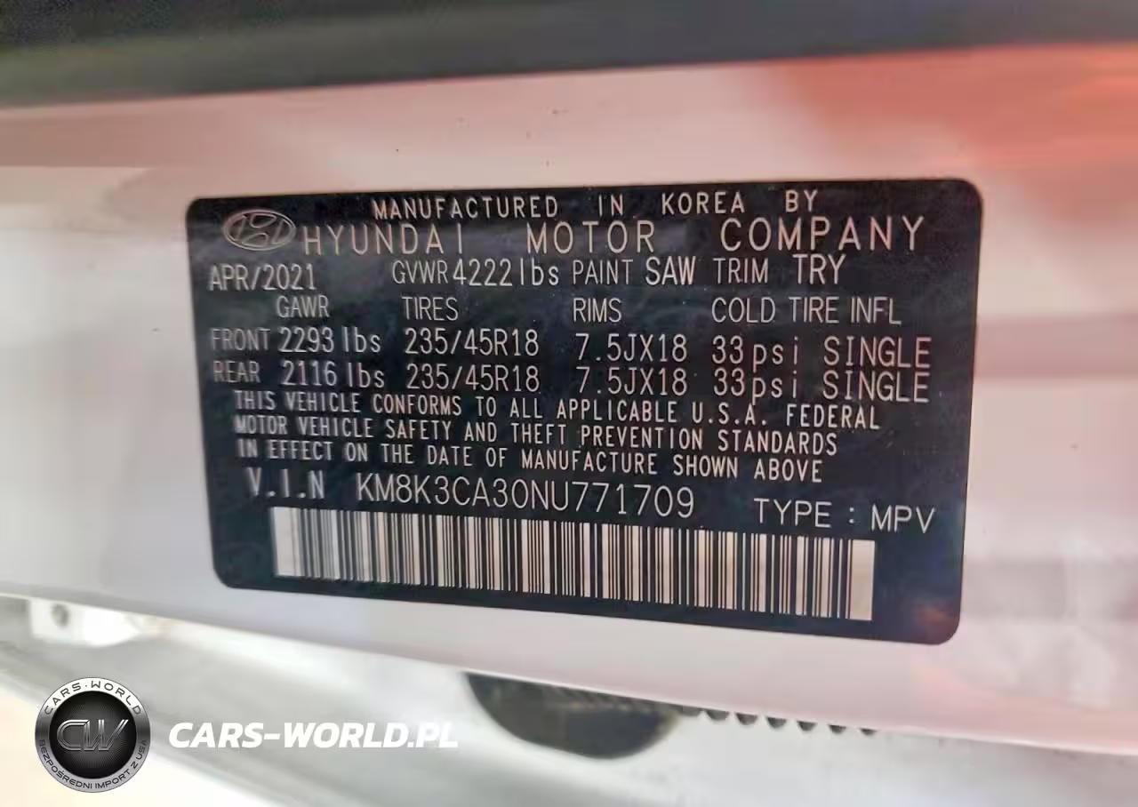 Copart Nr: C-46884366 VIN: KM8K3CA30NU771709 Port: Elizabeth, NJ