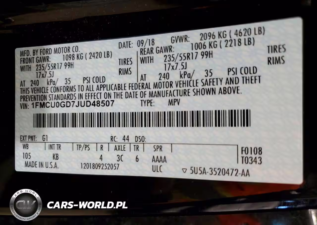 Copart Nr: C-46927666 VIN: 1FMCU0GD7JUD48507 Port: Elizabeth, NJ