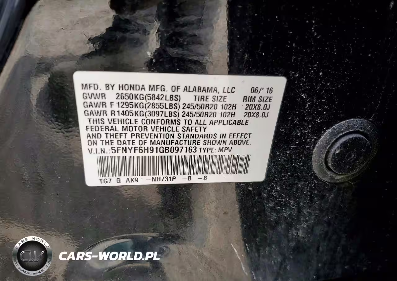 Copart Nr: C-47005036 VIN: 5FNYF6H91GB097163 Port: Indianapolis, IN
