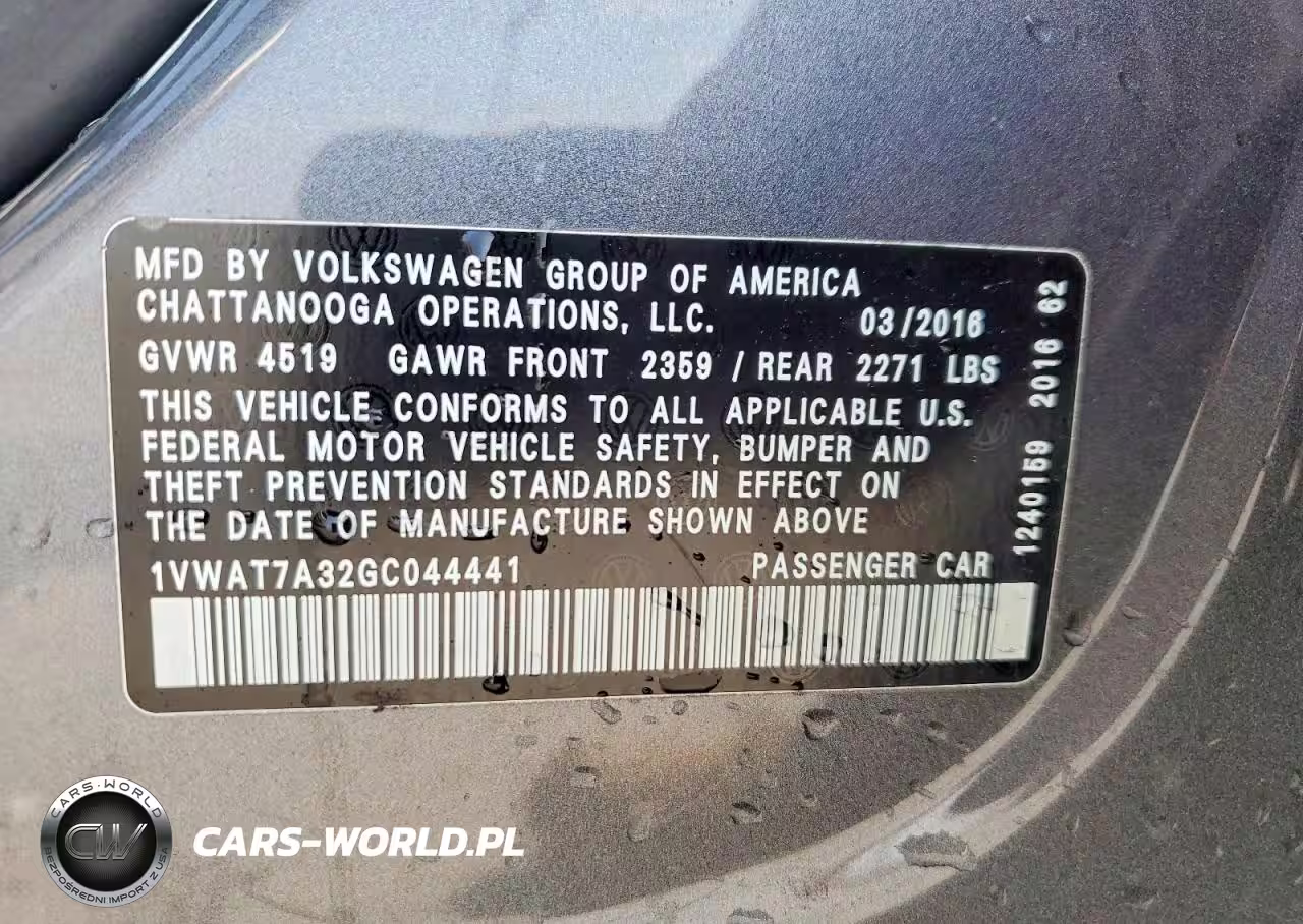 Copart Nr: C-47013836 VIN: 1VWAT7A32GC044441 Port: Savannah, GA