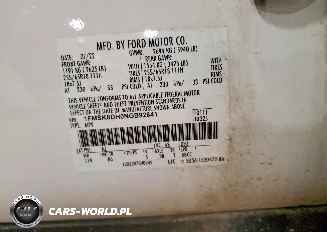 Copart Nr: C-47045446 VIN: 1FMSK8DH0NGB92841 Port: Indianapolis, IN