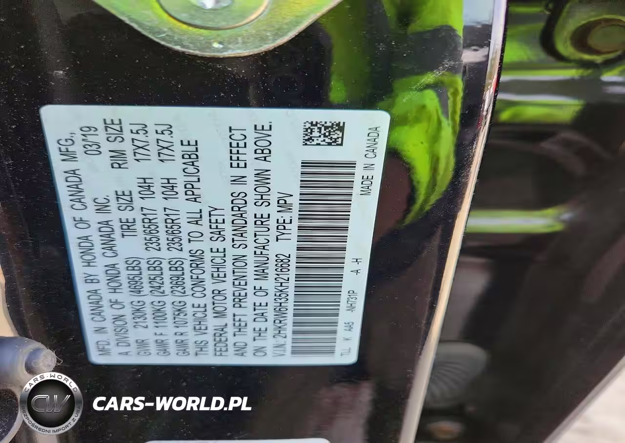 Copart Nr: C-47066856 VIN: 2HKRW6H35KH216682 Port: Elizabeth, NJ