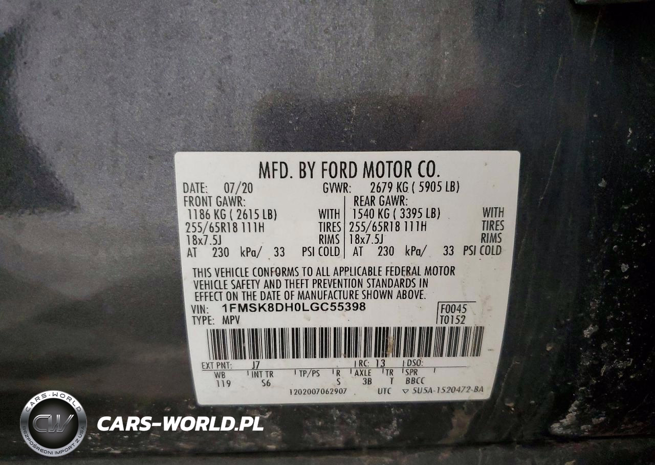 Copart Nr: C-47085766 VIN: 1FMSK8DH0LGC55398 Port: Elizabeth, NJ