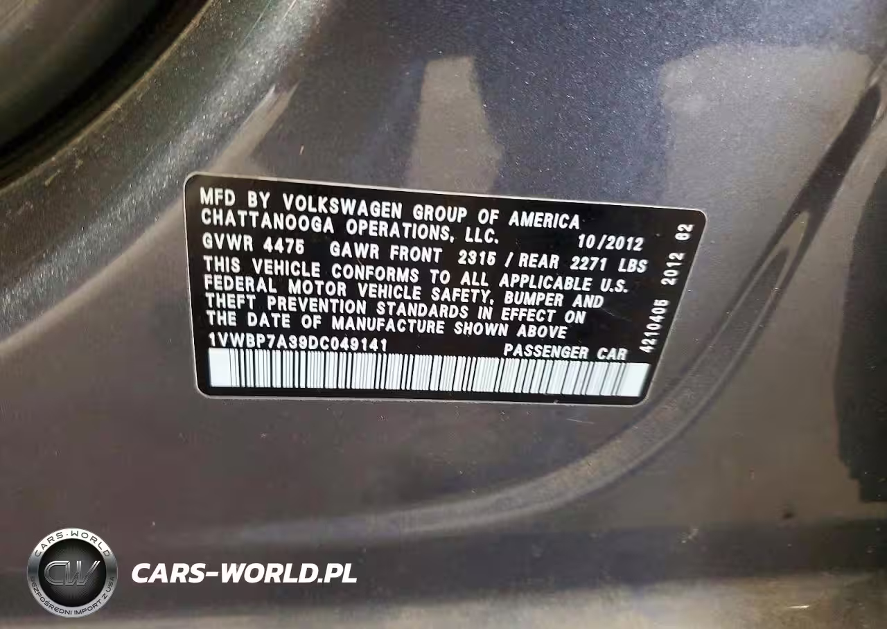 Copart Nr: C-47133336 VIN: 1VWBP7A39DC049141 Port: Elizabeth, NJ