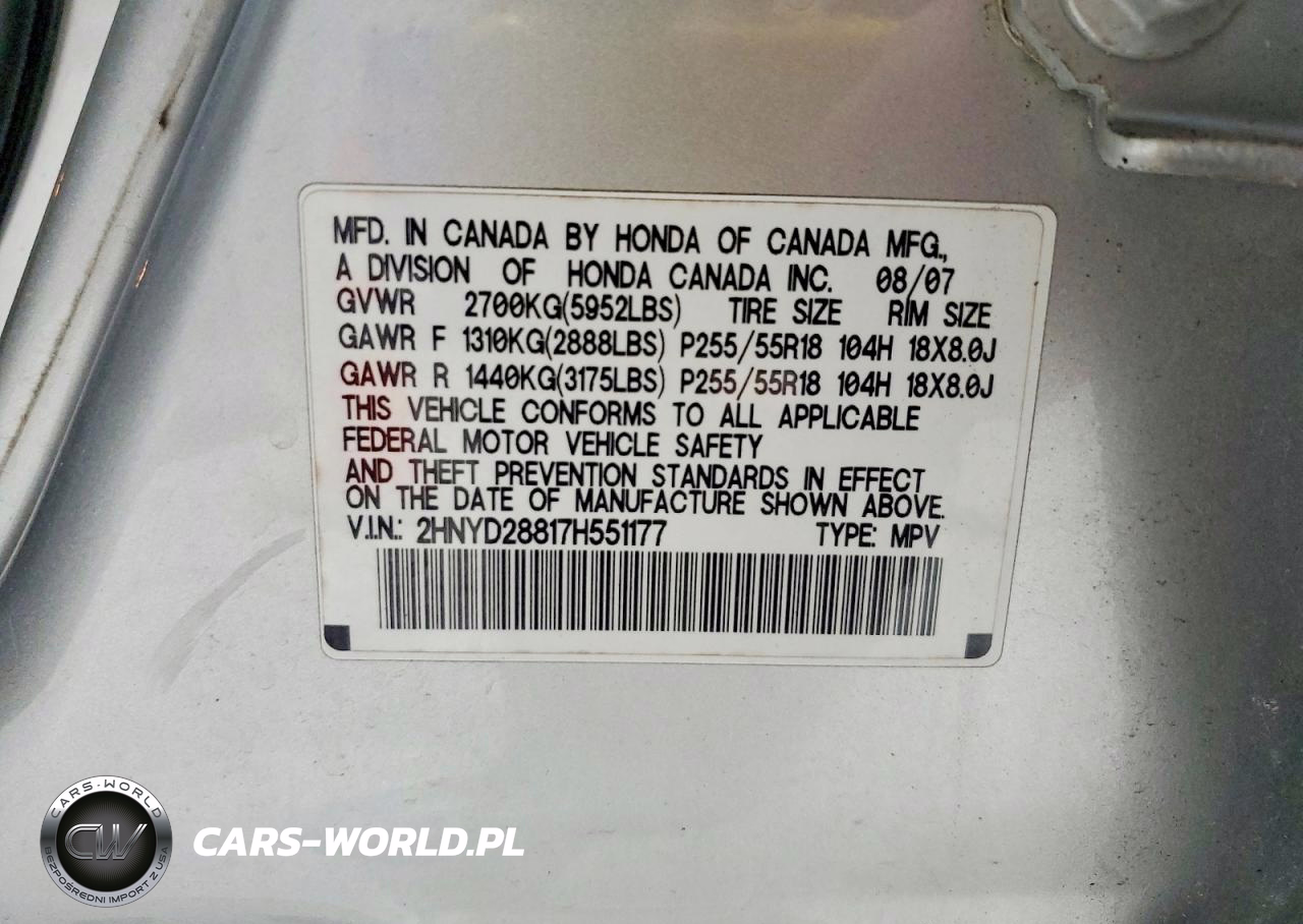Copart Nr: C-47213876 VIN: 2HNYD28817H551177 Port: Elizabeth, NJ