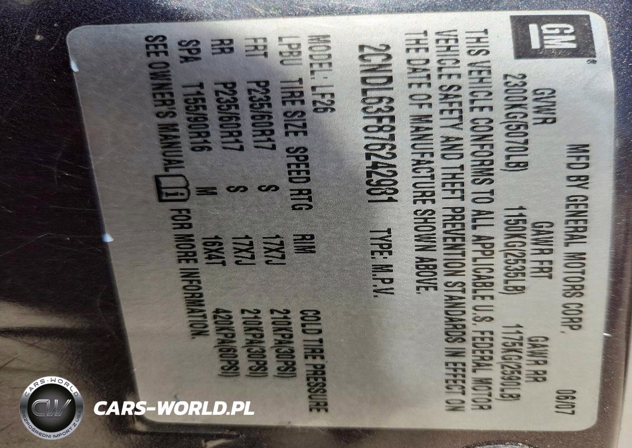 Copart Nr: C-47229156 VIN: 2CNDL63F876242981 Port: Elizabeth, NJ