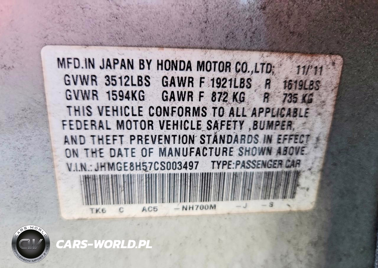 Copart Nr: C-47290456 VIN: JHMGE8H57CS003497 Port: Savannah, GA
