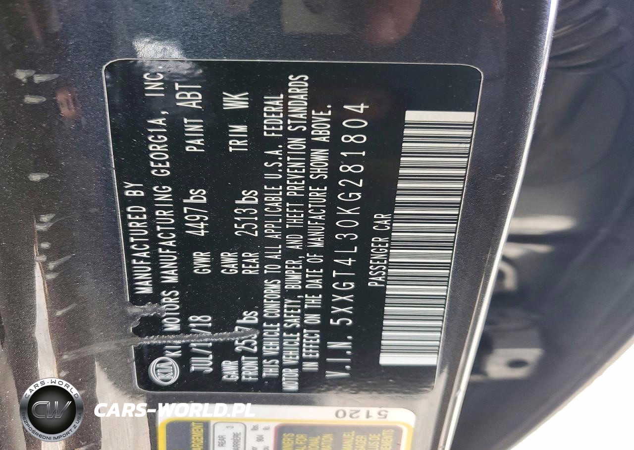 Copart Nr: C-47437626 VIN: 5XXGT4L30KG281804 Port: Elizabeth, NJ