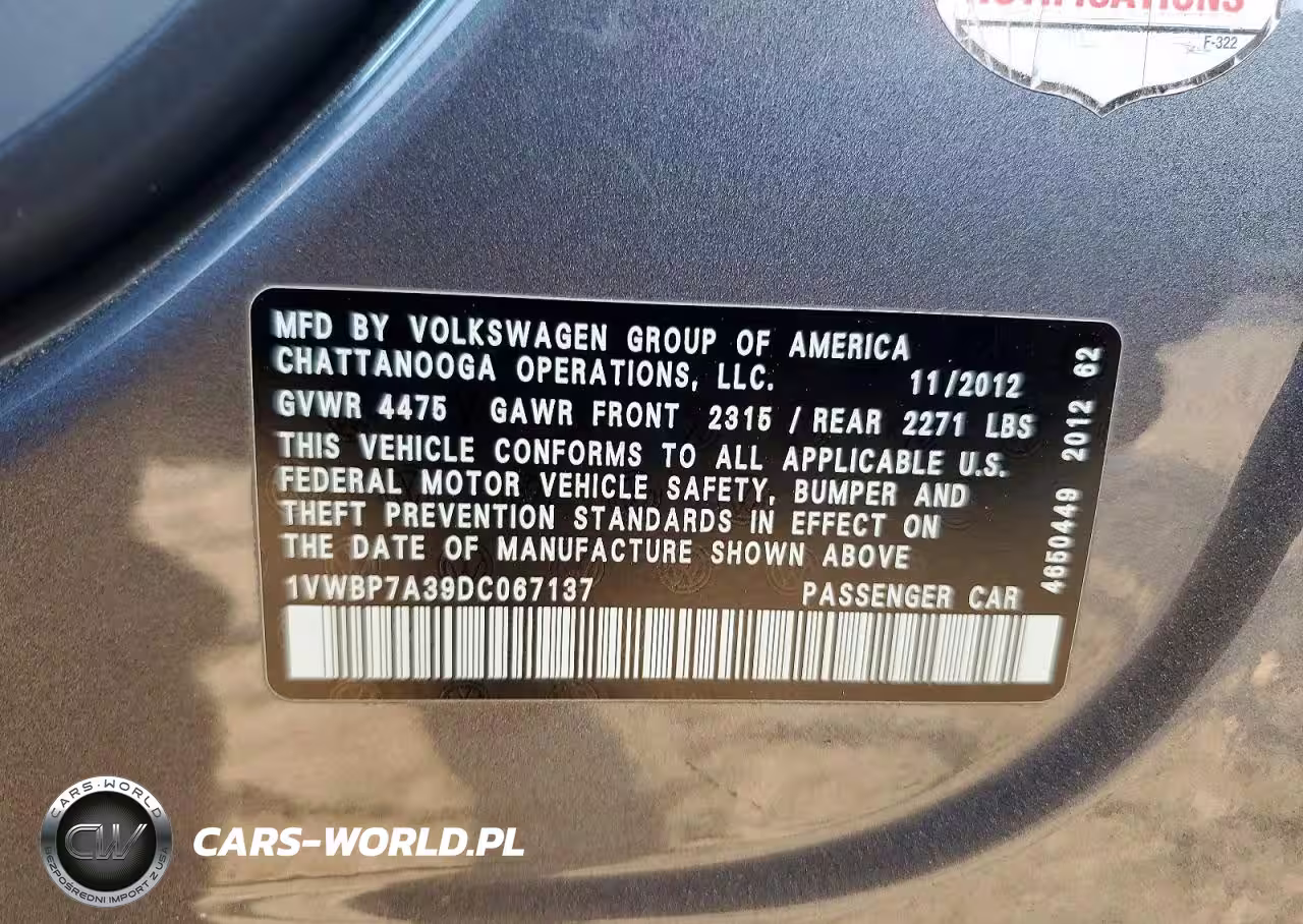 Copart Nr: C-47457346 VIN: 1VWBP7A39DC067137 Port: Savannah, GA