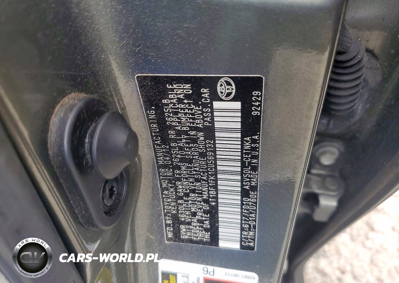 Copart Nr: C-47620426 VIN: 4T1BF1FK1CU569132 Port: Savannah, GA
