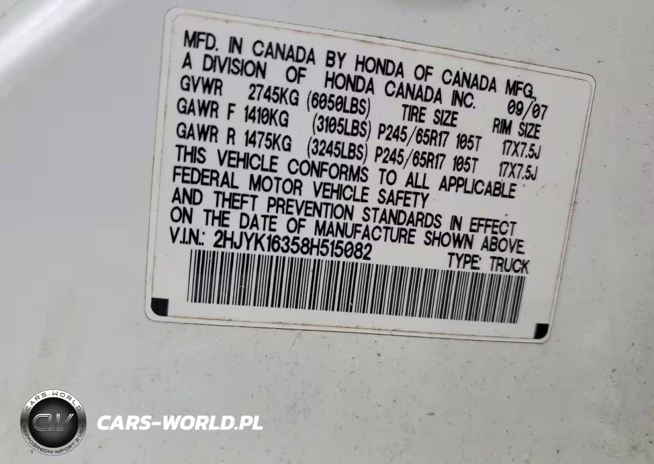 Copart Nr: C-47681246 VIN: 2HJYK16358H515082 Port: Elizabeth, NJ