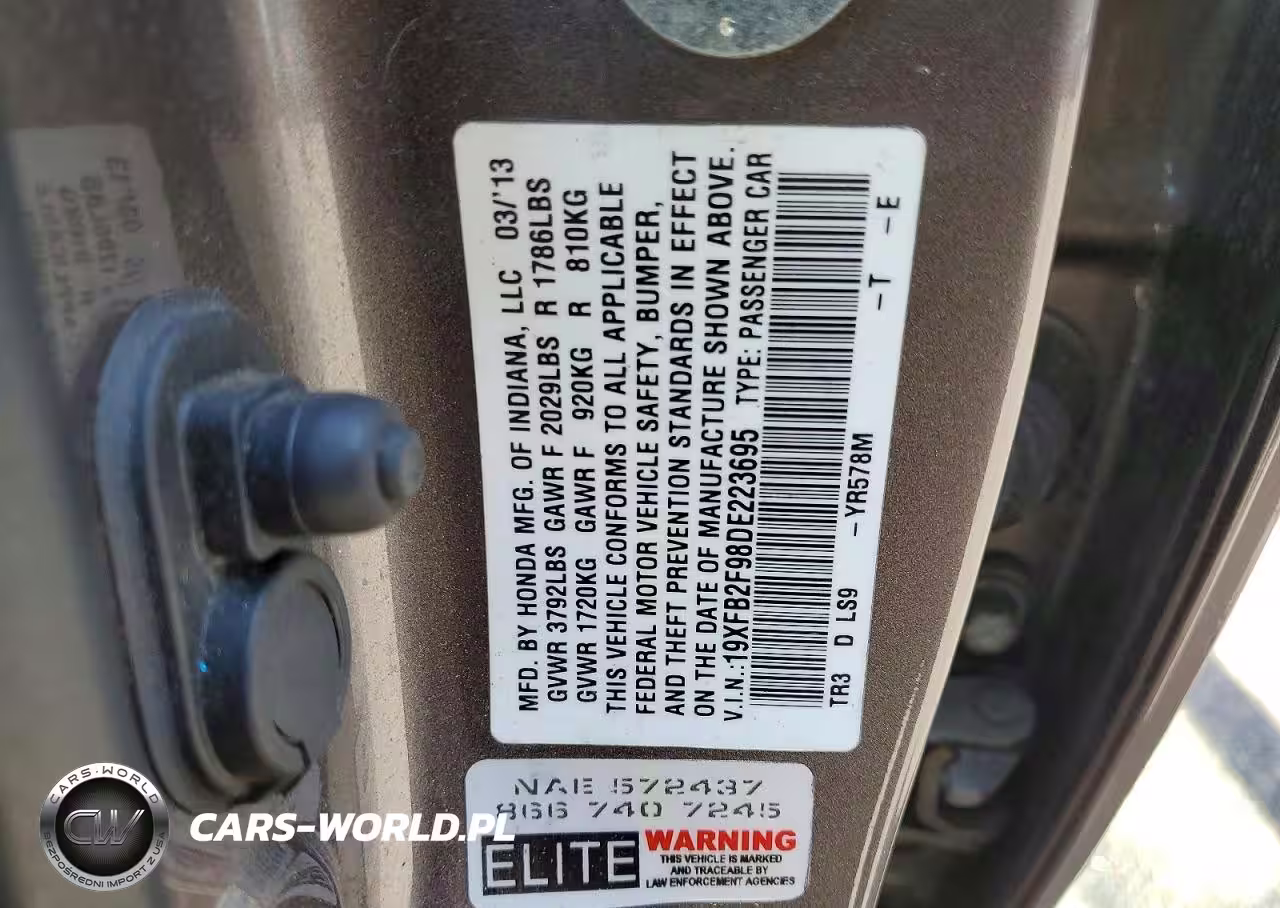 Copart Nr: C-47705546 VIN: 19XFB2F98DE223695 Port: Los Angeles, CA