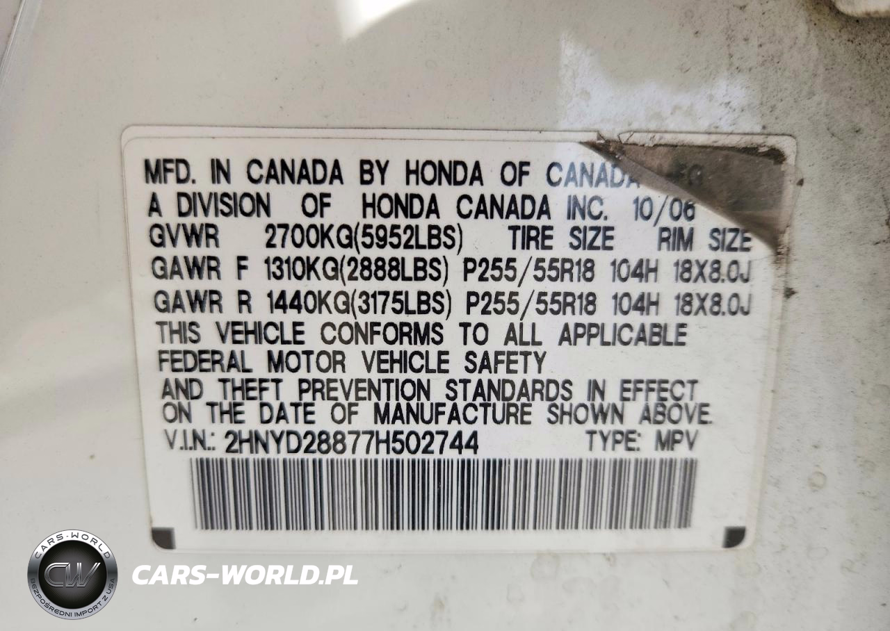 Copart Nr: C-47757656 VIN: 2HNYD28877H502744 Port: Elizabeth, NJ