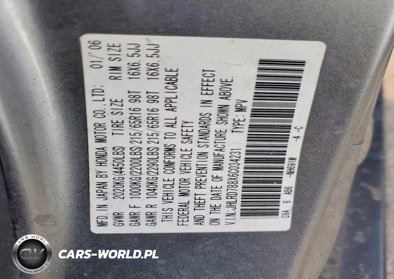 Copart Nr: C-47799766 VIN: JHLRD788X6C034231 Port: Indianapolis, IN