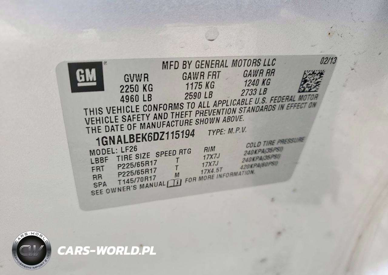 Copart Nr: C-47893206 VIN: 1GNALBEK6DZ115194 Port: Indianapolis, IN