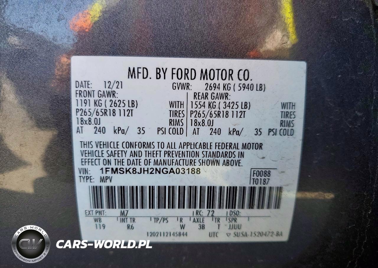 Copart Nr: C-48098366 VIN: 1FMSK8JH2NGA03188 Port: Los Angeles, CA