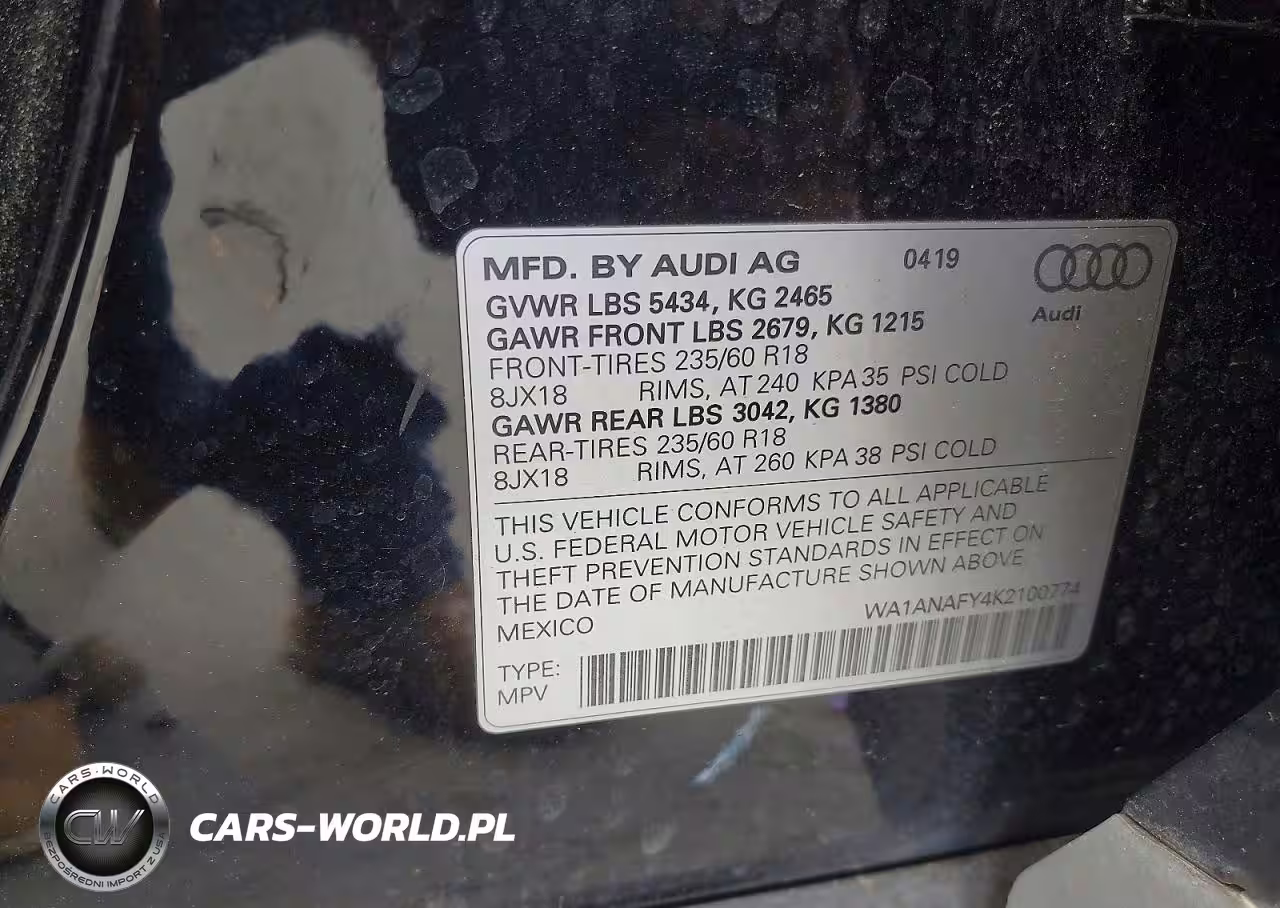 Copart Nr: C-48188056 VIN: WA1ANAFY4K2100774 Port: Savannah, GA