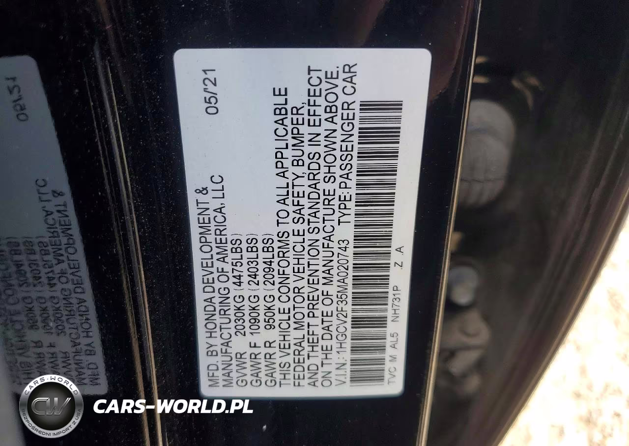 Copart Nr: C-48194596 VIN: 1HGCV2F35MA020743 Port: Elizabeth, NJ