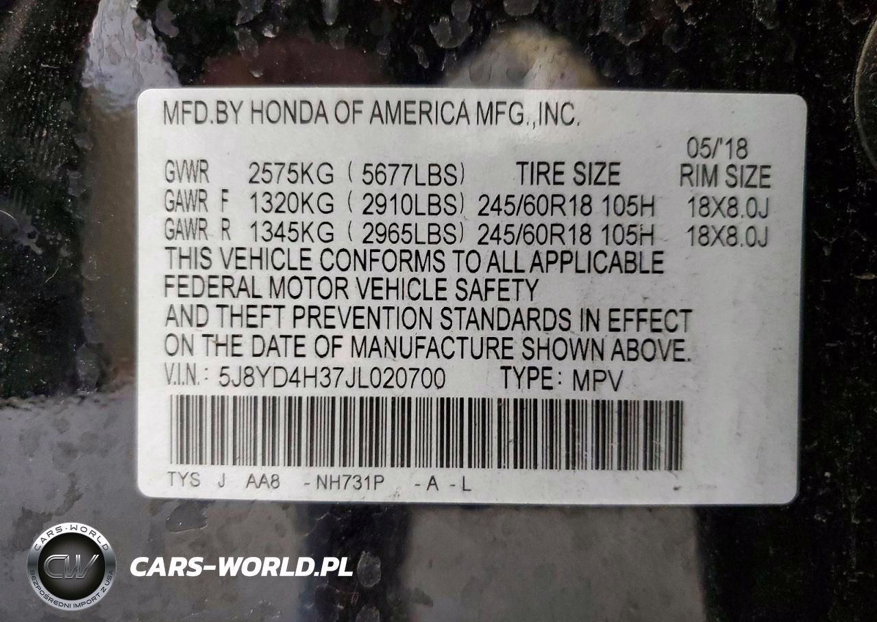 Copart Nr: C-48236136 VIN: 5J8YD4H37JL020700 Port: Elizabeth, NJ