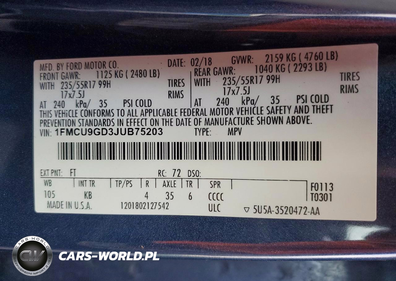 Copart Nr: C-48236756 VIN: 1FMCU9GD3JUB75203 Port: Elizabeth, NJ