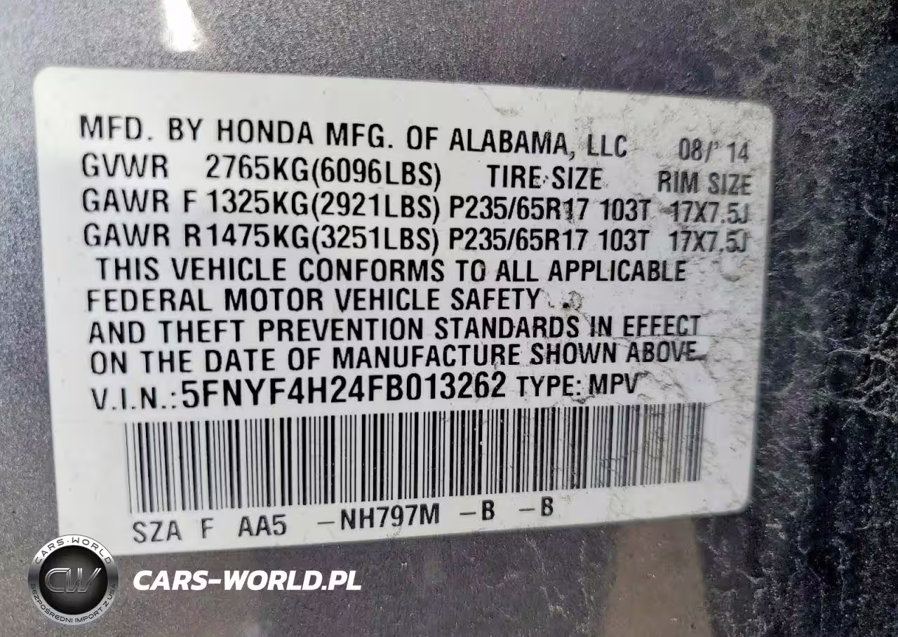 Copart Nr: C-48263626 VIN: 5FNYF4H24FB013262 Port: Elizabeth, NJ