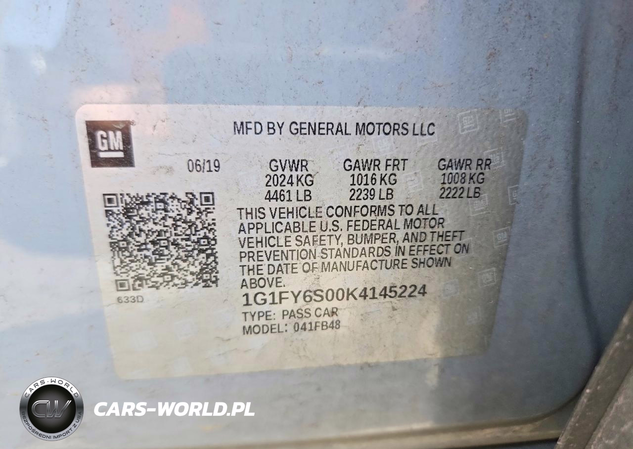 Copart Nr: C-48335656 VIN: 1G1FY6S00K4145224 Port: Elizabeth, NJ
