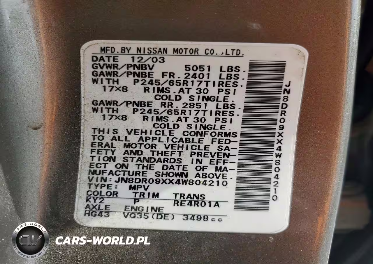 Copart Nr: C-48500566 VIN: JN8DR09XX4W804210 Port: Savannah, GA
