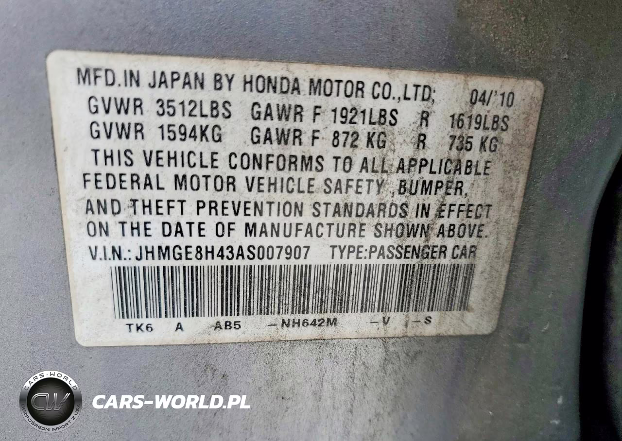Copart Nr: C-48788976 VIN: JHMGE8H43AS007907 Port: Elizabeth, NJ