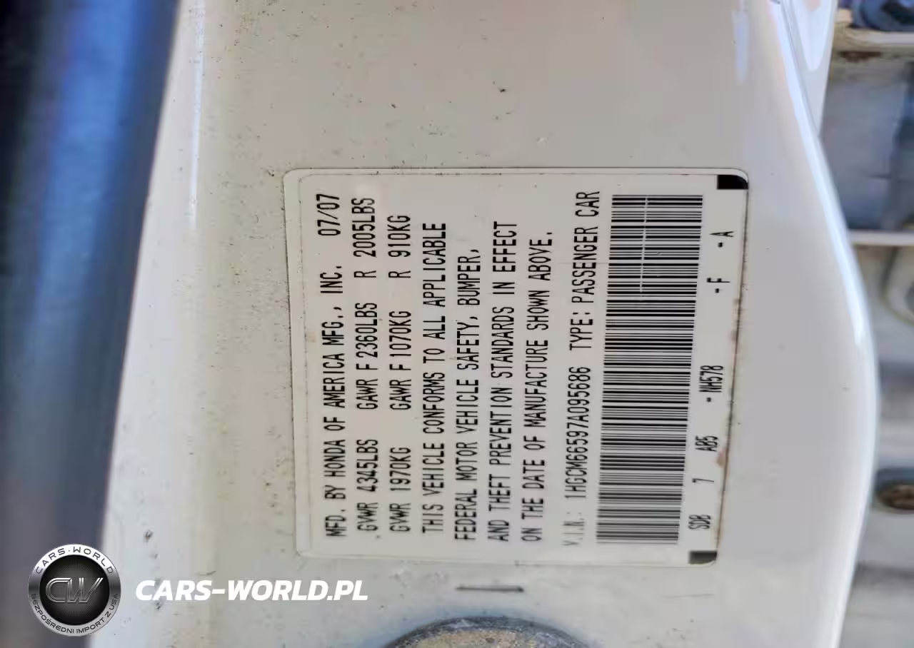 Copart Nr: C-48833786 VIN: 1HGCM66597A095686 Port: Savannah, GA