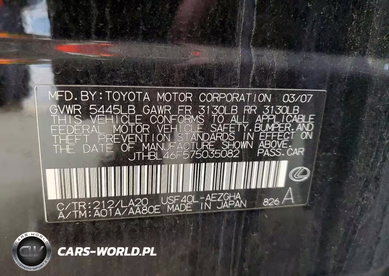 Copart Nr: C-48873786 VIN: JTHBL46F575035082 Port: Los Angeles, CA