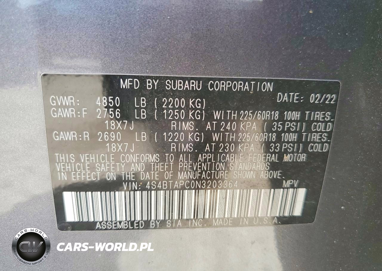 Copart Nr: C-48903496 VIN: 4S4BTAPC0N3203364 Port: Savannah, GA