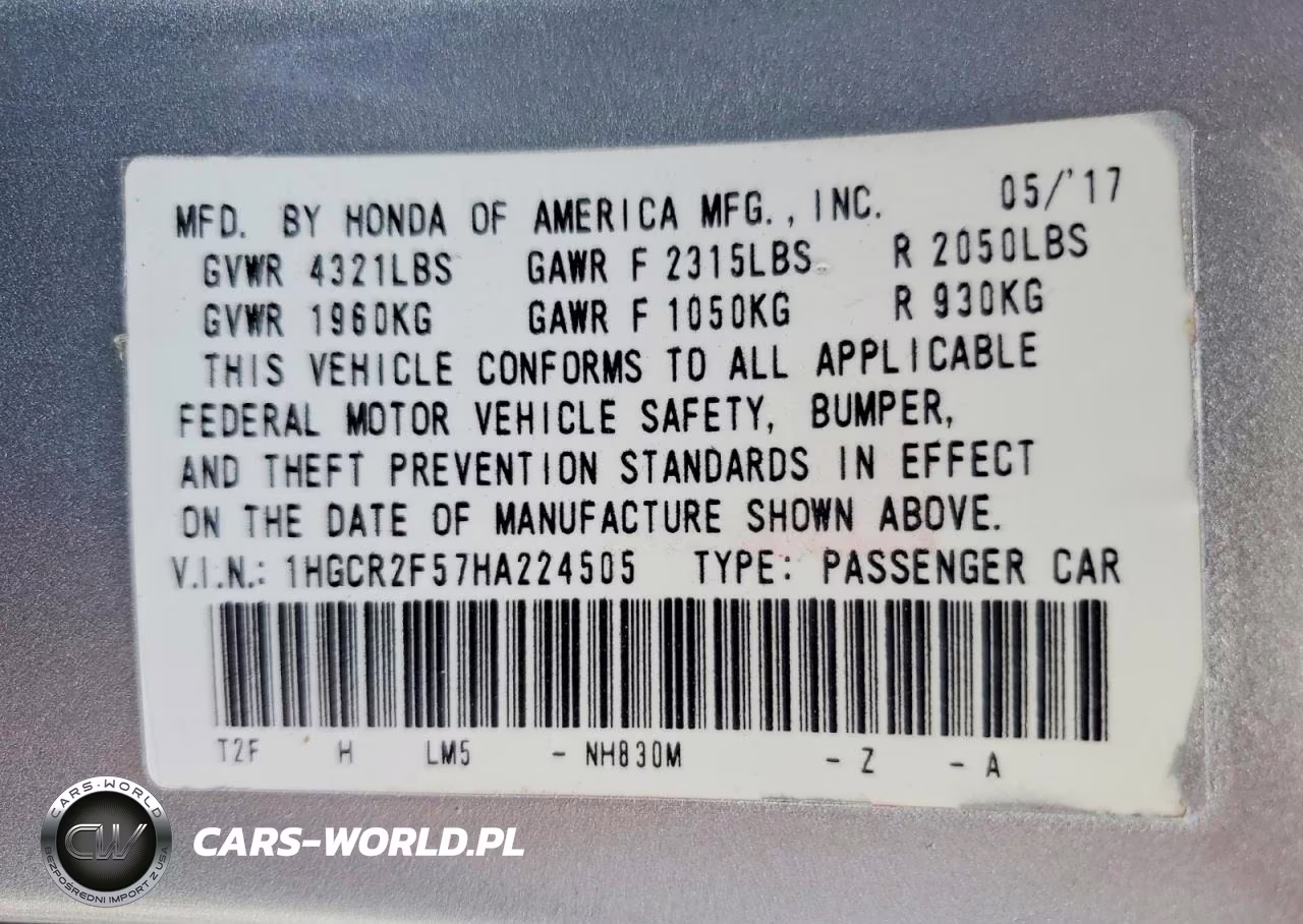 Copart Nr: C-49060676 VIN: 1HGCR2F57HA224505 Port: Los Angeles, CA