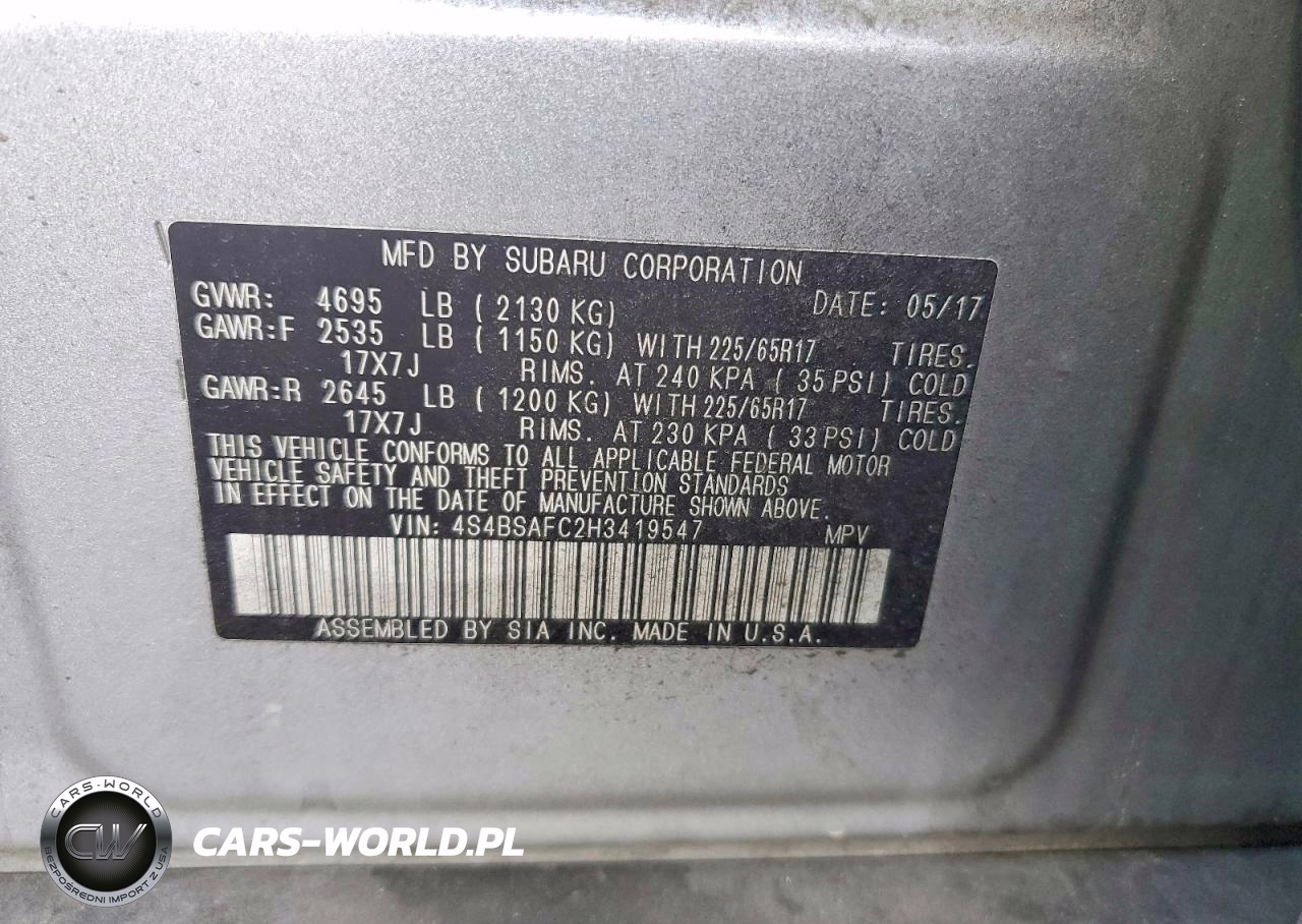Copart Nr: C-49078396 VIN: 4S4BSAFC2H3419547 Port: Savannah, GA