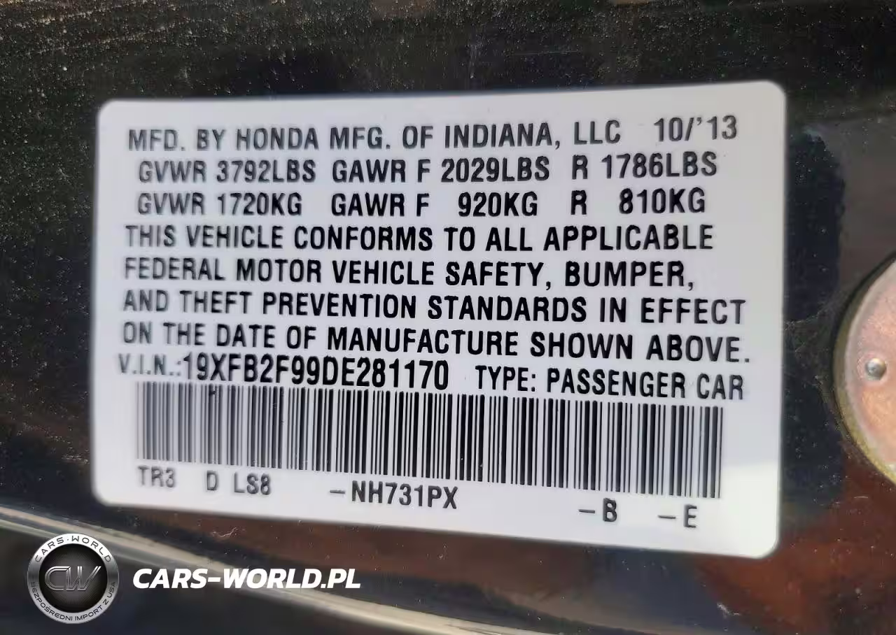 Copart Nr: C-49138396 VIN: 19XFB2F99DE281170 Port: Los Angeles, CA