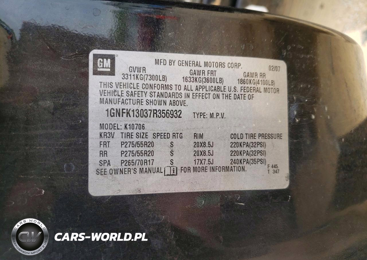 Copart Nr: C-49240516 VIN: 1GNFK13037R356932 Port: Elizabeth, NJ