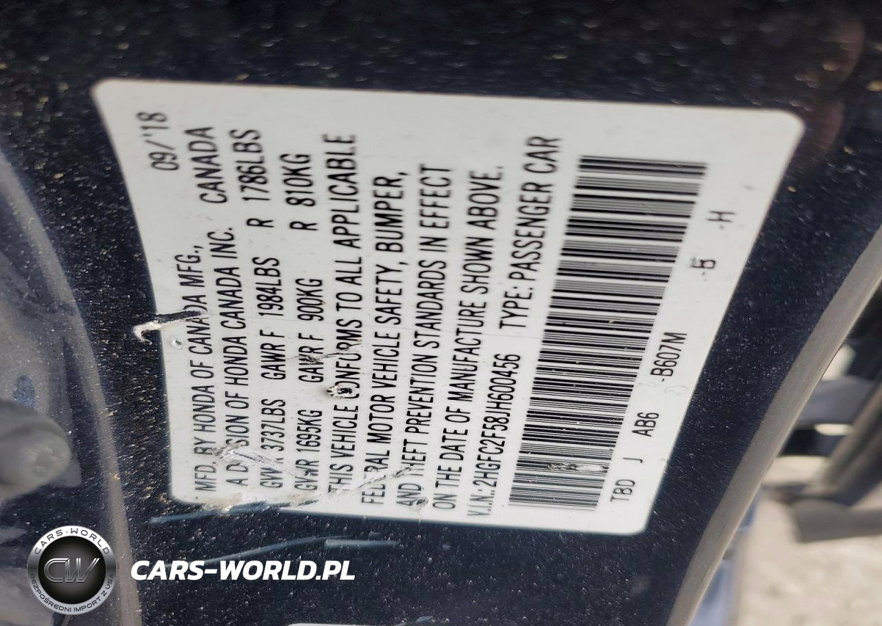 Copart Nr: C-49571026 VIN: 2HGFC2F58JH600456 Port: Indianapolis, IN