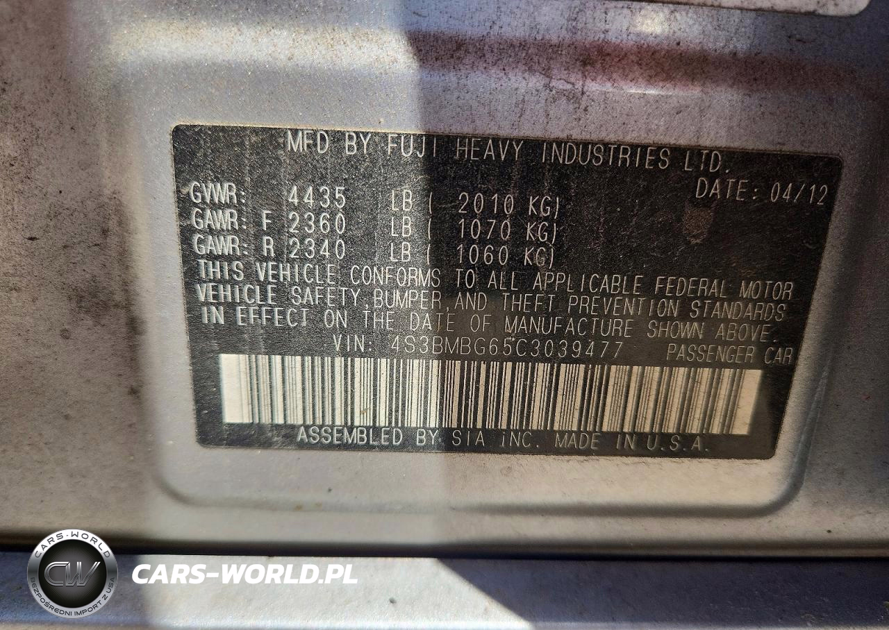 Copart Nr: C-49658506 VIN: 4S3BMBG65C3039477 Port: Savannah, GA