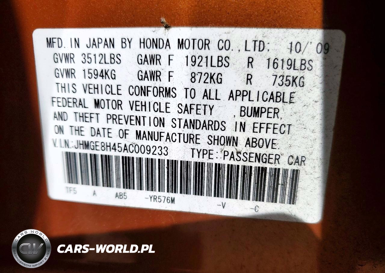 Copart Nr: C-49675096 VIN: JHMGE8H45AC009233 Port: Los Angeles, CA