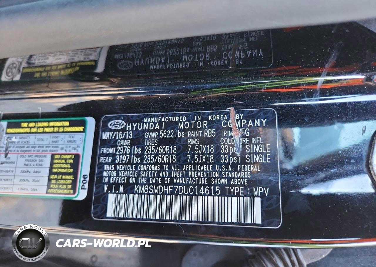 Copart Nr: C-50150676 VIN: KM8SMDHF7DU014615 Port: Savannah, GA